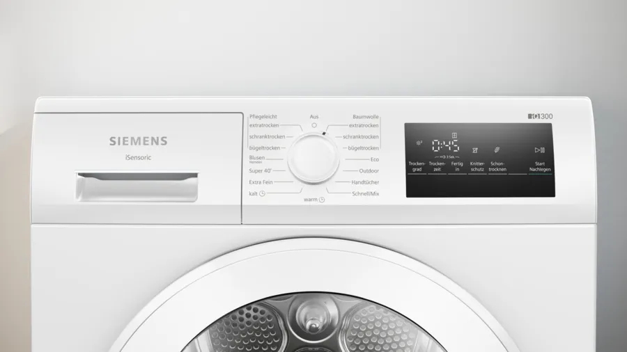 - Trockenprogramme: Outdoor/Sport, Baumwolle, Buntwäsche, Kalt, Leise/Nacht, Wolle, Spezialprogramme, Standardprogramme, Handtücher, Schranktrocken, Hemden/Blusen, Zeitprogramm kalt, Zeitprogramm warm, Automatikprogramm, Pflegeleicht, Mischgewebe